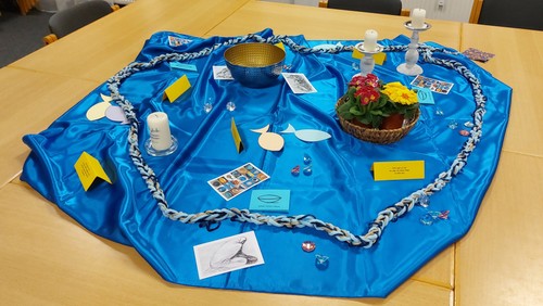 So trafen sich ab Mitte Januar 14 Personen an vier Abenden im KiWie. Unter der Leitung von Sigrun und Reimund Lenth empfing die Teilnehmer ein Stuhlkreis, in deren Mitte eine große goldene Schale auf einem tiefblauen Tuch stand und wie die Sonne leuchtete. Diese und weitere Schalen, mal gefüllt mal leer, begleiteten uns durch alle Einheiten.