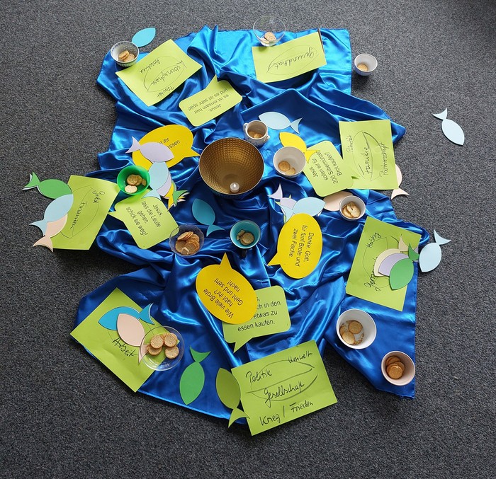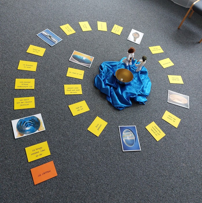 Während wir unser Leben anhand von biblischen Geschichten betrachteten, kamen im Laufe eines Abends weitere Elemente zum Bodenbild hinzu: Es wurde geschrieben, bearbeitet, umgedreht und neu sortiert, so dass sich nach und nach eine neue Optik ergab.