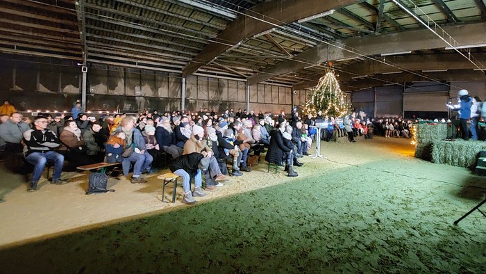 Am 13. Dezember fand im Reitstall von Bernd Lohmann wieder „Weihnachten im Stall“ statt. Schon vor Beginn des Gottesdienstes konnte man die besondere Atmosphäre wahrnehmen: Während es draußen bereits dunkel wurde, verwandelten drinnen ein festlich geschmückter Weihnachtsbaum, viele Kerzen und Lichter die Reithalle in einen ganz besonderen Ort für einen Weihnachtsgottesdienst. Um den Baum herum konnten in kleinen Holzverschlägen Ponys, Schafe und Kälber aus nächster Nähe bestaunt werden. Aufgeregte Kinder, gefolgt von ihren Eltern und Großeltern, flitzten durch die Reithalle und nahmen auf Bierzeltbänken und Strohballen Platz. Rund 350 kleine und große Menschen strömten mit Vorfreude in die Reithalle, um an dem Gottesdienst „der etwas anderen Art“ teilzunehmen. Und dann ging es endlich los: Pfarrerin Dr. Anke Mühling und Pfarrer Reimund Lenth hatten gemeinsam mit den Konfirmand:innen den Gottesdienst eindrucksvoll und lebendig gestaltet. Zusätzlich sorgte Reimund Lenth mit seiner Gitarre für musikalische Unterstützung und dank der Liedtexte auf einer großen Leinwand hatte wirklich niemand mehr eine Ausrede, um nicht „Dicke rote Kerzen“ oder „Oh Tannenbaum“ mitzusingen. Wer bis zu diesem Punkt noch nicht in Weihnachtsstimmung war, der war es spätestens jetzt. Zum Abschluss durften die Kinder sich am Ausgang noch eine Überraschung abholen, und für die meisten Besucher:innen war wohl klar: Nächstes Jahr sind wir wieder dabei!